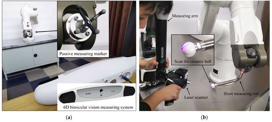 Afterward, the MultiCal system was removed, and a 6D binocular vision measuring system (Figure 9) and a measuring arm with a laser scanner were used to conduct traditional calibration procedures, applying the method described in [6]. A short measuring rod was installed at the robot’s end during the laser scanner trial to reduce deformation error, and the surface of the rod’s precision ball was scanned. The spherical centre’s position was obtained through spherical fitting in PolyWorks. The laser scanner and scanning method were also used for validation, with one hundred sets of robot configurations selected in a large portion of the robot’s workspace.