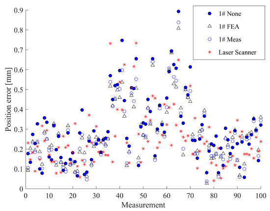 After conducting the calibration experiment, the results were obtained (Table 3). The measuring arm with a laser scanner achieved the highest calibration accuracy, while the MultiCal system with various measuring rods and deformation compensation methods also demonstrated good calibration performance, improving the robot’s average and maximum positioning accuracy from 74% to 89% and 69% to 88%, respectively. However, the binocular vision system exhibited the poorest calibration accuracy, likely due to its lower measurement accuracy. Notably, almost all the improvement methods, including the use of carbon fibre measuring rods and deformation compensation methods, improved the MultiCal system’s calibration accuracy compared to the previous work presented in [6]. Specifically, the MultiCal system with the 1# measuring rod and Meas compensation method achieved the highest calibration accuracy, with an average and maximum positioning accuracy of 0.274 mm and 0.838 mm, respectively, similar to that of the laser scanner.