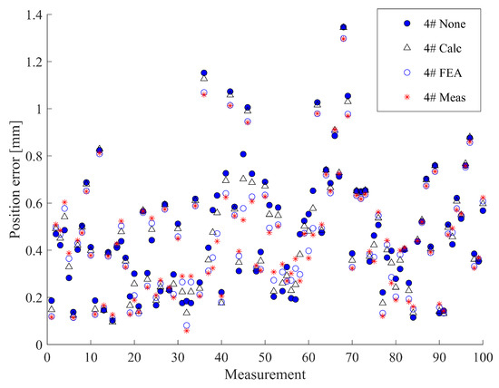 To facilitate a better comparison of the different compensation methods, we analysed the positioning error distribution obtained by 1# and 4# using different methods (Figure 10 and Figure 11). The results indicate that the error distributions obtained by different methods are very similar since these compensation methods only adjust the measurement coordinates slightly without significantly affecting the overall measurements. Moreover, the primary effect of deformation compensation is to reduce the error of large error points and make the error distribution more uniform. In the case of stainless-steel measuring rods, the results of Meas are comparable to those of FEA since their actual stiffness is close to the simulated stiffness (the rod correction factors are close to one). For carbon fibre measuring rods with a correction factor exceeding 1.2, in most cases, Meas is slightly better than FEA.