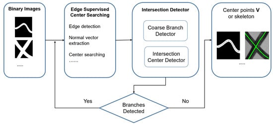 This figure shows the structure of our algorithm. The inputs are binary images and the outputs are points or skeletons. The two main modules of the system are the Edge Supervised Center Searching and Intersection Detector.