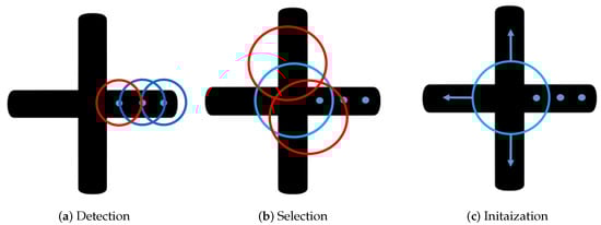 Before initiating a new branch, selecting a suitable initialization point is crucial for a successful search. As shown in Figure 4b,c, the algorithm uses a circle to intersect with the object in order to determine an appropriate initial pixel for each branch. The radius of the circle is . This step is referred to as coarse intersection selection. The primary objective of this procedure is to detect all the branches and provide a suitable search direction. The following cost function is used to evaluate the circle: