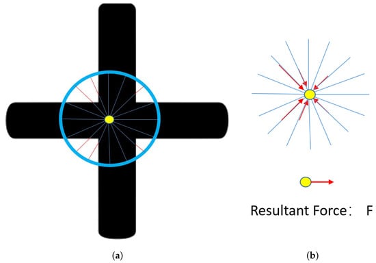 As is shown in (a), 16 beams are evenly distributed at 360 degrees from the center of the coarse detection circle. (b) shows components of the resultant force F are the red vectors from (a).