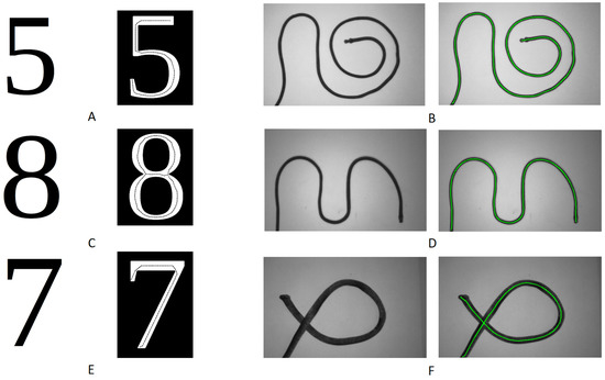 This is the demonstration of the skeletonization results on number images, cables, ropes, and wires. To apply our algorithm, we needed to transform the right parts of the grayscale images into binary images. The green lines are the detected results. The figures (A,C,E) are the detection results of number binary images. The figures (B,D,F) are the detection results of rope, iron wire, and cable.