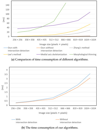The primary goal of this research was to achieve high speed in extracting linear objects’ skeletons from binary images. To demonstrate the efficiency of our algorithm, we performed the following speed tests to demonstrate the time consumptions for different sizes of images. The results are compared with some of the most commonly used methods: Zhang’s method, Lee’s method, Medial axis skeletonization, and Morphological thinning.