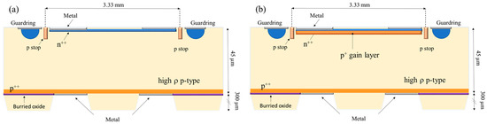 Schematic transversal cross-section of the investigated samples: (a) PAD diode; (b) LGAD.