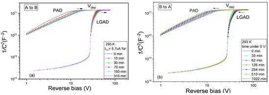 C-V characteristics of irradiated PAD and LGAD samples recorded at 293 K for: (a) different injection times with IFw = 5.7 µA when the BCD defect changes from A to B configuration; (b) different times passed from the end of injection, with samples kept in dark and under 0 V, when the BCD defect returns back in the A configuration.