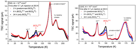 In general, such changes in Vdep, and so in Neff, can be caused by variations in the concentration of acceptors, of donors, or of both. TSC investigations can clarify this aspect by showing exactly what type of defects encounter changes in the concentration. In Figure 3 are the TSC spectra measured on PAD and LGAD diodes after the small forward current injection was performed at 293 K for 3 h and the BCD defect switched from A to B configuration. However, the first TSC spectrum can be recorded only 2 h after the injection is performed. Similar to what was previously shown in [32], significant changes in the TSC peaks are observed only for the BCD defect, and these were detected only in the A configuration.