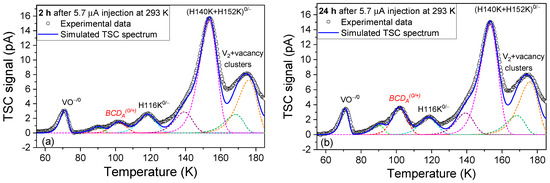 Simulation of the TSC signal measured with VR = 100 V at different time intervals after the BCD defect switched from A to B configuration in the PAD diode: (a) 2 h; (b) 24 h. The colored dashed lines represent the simulated TSC signals corresponding to each of the defects detected in this study and the straight blue line is the resulting total simulated TSC spectrum.