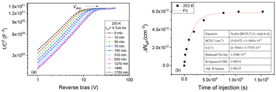 PAD diode injection with IFw = 5.7 µA at 253 K: (a) C-V characteristics measured after different times of injection; (b) variation in Neff with injection time. Fit according to Equation (13).