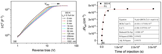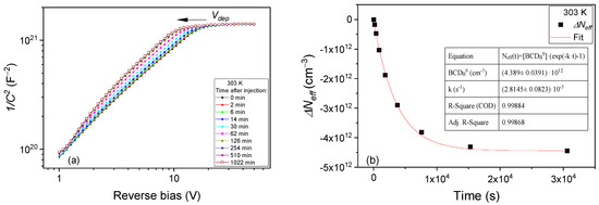PAD diode injection of with IFw = 5.7 µA at 303 K: (a) C-V characteristics measured after different times of injection; (b) variation in Neff with injection time. Fit according to Equation (13).