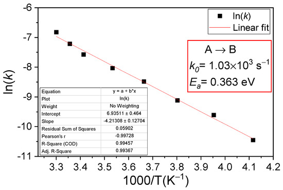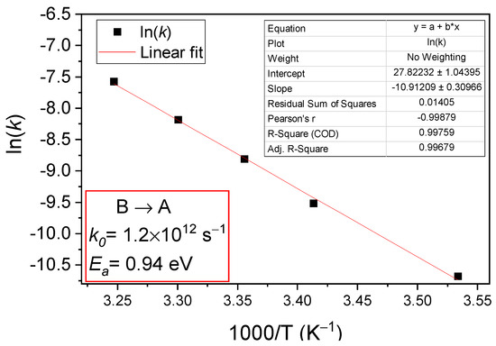 The variation in terms of temperature in the B to A configurational transformation rate is represented in the Arrhenius plot in Figure 10. For the B to A defect conversion, an energy barrier of EB→A = 0.94 eV and a constant rate in the order of 1012 s−1 are determined. The k0B→A value is typical for free-carrier emission.
