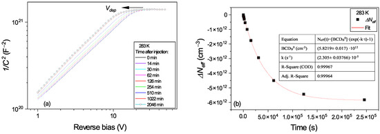 PAD diode after the 5.7 µA forward current injection was performed at 283 K: (a) C-V characteristics measured at different times after injection; (b) variation in Neff in time. Fit according to Equation (14).