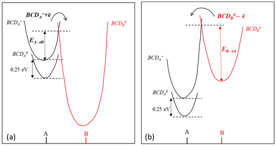 Configuration coordinate diagram for the BCD defects in silicon: (a) in non-equilibrium conditions under small forward injection; (b) in the absence of free electrons in excess. The configurational coordinate—energy curves are represented in black and red for the A and B configurations, respectively. The arrows indicate the transition points between the defect configurations, accompanied by the capture (a) or by the emission of electrons. The experimental values for change in the BCD structural configuration are EA→B = 0.363 eV and EB→A = 0.94 eV.