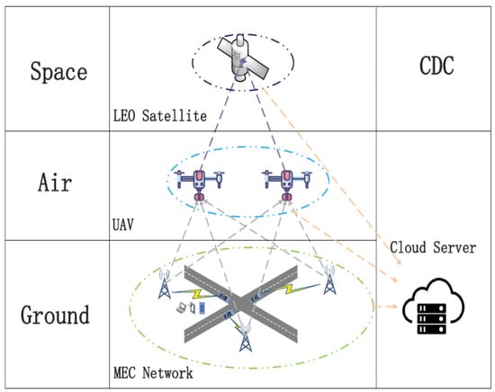 On the other hand, computing capacity and energy resources in edge nodes are often insufficient to meet the demands of all edge tasks []. Task offloading decisions are largely influenced by these factors. Some researchers have addressed these issues from the perspective of an edge–cloud collaboration []. Researchers have also turned their attention to the space–air–ground integrated network (SAGIN) to allocate more resources. SAGIN is an integration of the space layer, aerial layer, and ground layer. As a multidimensional network, SAGIN adopts different communication protocols in each segment or integrates different segments to achieve high throughput and reliable data delivery [].