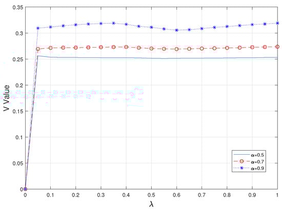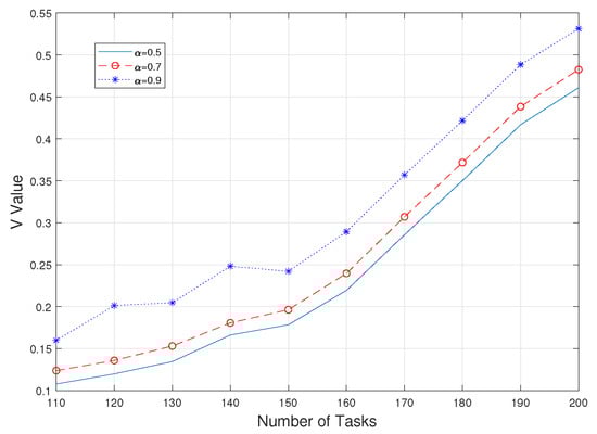 Second, observing the value of V gives a more intuitive view of the degree of consideration of risk in CVaR. As shown in Figure 3 and Figure 4, it is obvious that the value of V is larger when a higher alpha value is taken, i.e., when the worse part of the fuzzy set is used as a criterion; at the same time, this value is almost unaffected by the value of taken. However, with a fixed value of , as the simultaneous uploading of tasks increases, the value of V for each experiment also increases gradually and steadily, which means that the value of CVaR also increases; that is, the risk is further considered as a way to ensure the authenticity and practicality of the whole system.