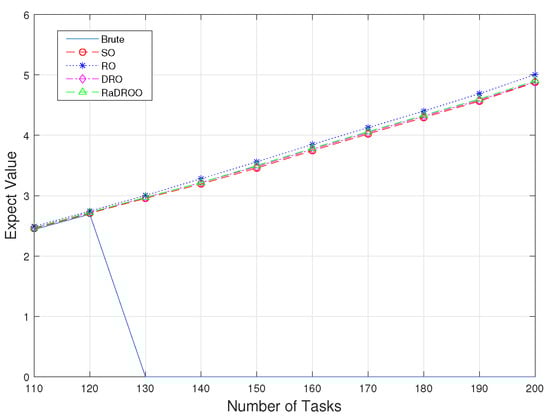 In the two observations with 150 and 170 tasks, we can clearly see from Figure 6 and Figure 7 that the cost results obtained by the RaDROO algorithm are slightly higher than those of the traditional DRO algorithm. Obviously, as the number of tasks gradually increases, the Brute-Force algorithm that fails to consider offloading the second-stage tasks to the cloud for computations can no longer produce solutions. At the same time, the results obtained by the RaDROO algorithm and the DRO algorithm are close to those of the SO algorithm, while significantly lower than those of the RO algorithm. The SO algorithm, as it calculates the average of the fuzzy sets, is capable of obtaining excellent results, but it may not align closely with real-world scenarios. On the other hand, the RaDROO algorithm considers various factors and still manages to achieve results that are close to those of the SO algorithm, demonstrating its superiority. This indicates that the RaDROO algorithm is still capable of achieving favorable results. By incorporating CVaR to enhance risk resistance, it generates superior outcomes even under uncertain computational resource conditions.