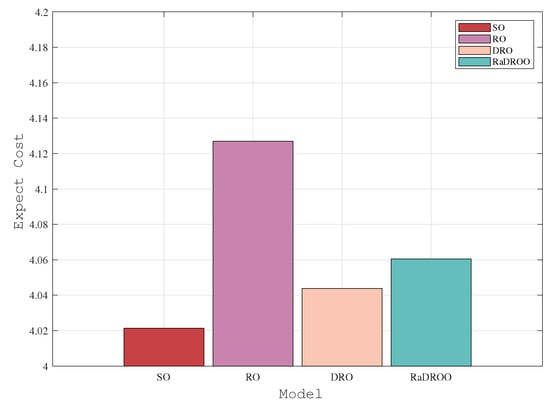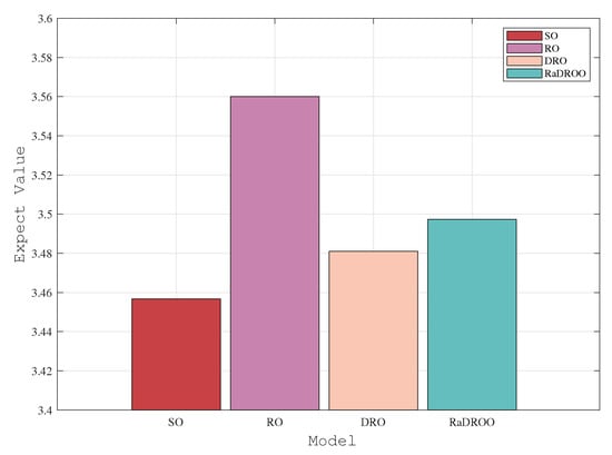 - In DRO [], the mean value in the range of the uncertainty set is obtained, and its optimal robust result is obtained by the min–max theory, which guarantees both robustness and practicality. However, there is also a drawback, namely that it is an uncertainty set constructed from historical data, which does not guarantee the stability of the uncertainty set and does not consider its risk.