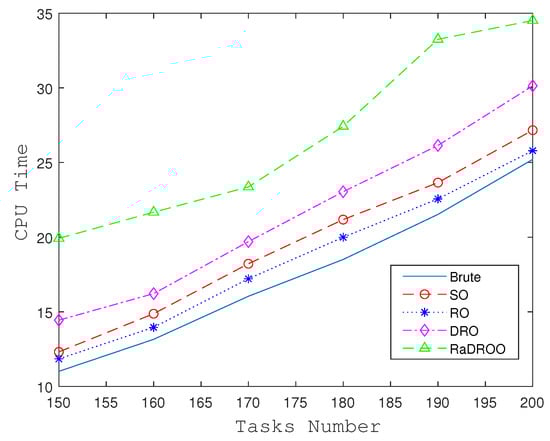 The comparison between algorithms takes the obtained target value as the evaluation criterion. Figure 5 shows the optimal cost results obtained by different algorithms at the same time as the number of tasks received increases. Figure 6 and Figure 7 present a comparison of the results obtained from the four algorithms at task volumes of 150 and 170. When the number of tasks is small, and only known allocatable resources are considered, all algorithms provide better results. As the total number of tasks that may be uploaded simultaneously rises, the Brute-Force algorithm fails to obtain an optimal solution because it does not take into account the lack of computational resources. In contrast, RO, SO, DRO, and RaDROO can obtain their optimal solutions, and the optimal cost obtained increases with the increasing number of tasks.