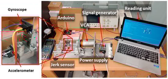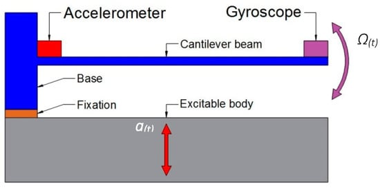 The jerk sensor consisted of a metal cantilever with a gyroscope mounted at its free tip, and an accelerometer mounted at its fixed end, as shown in Figure 1. The accelerometer was used once in practice to calibrate the jerk sensor sensitivity. When the jerk sensor (cantilever and gyroscope) was subjected to an excitation signal (), the jerk amplitude () was determined from the gyroscope reading () (angular velocity) and jerk sensitivity (), which will be explained in the next section.