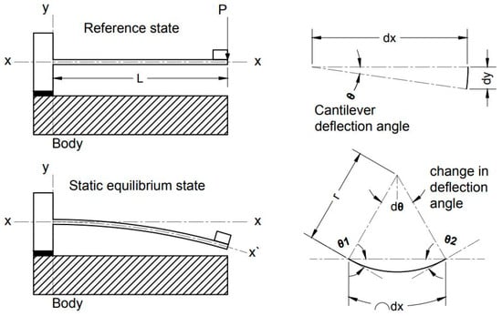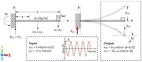 Consider a cantilever beam as shown in Figure 2; when the beam is statically analyzed under constant acceleration (), the beam self-mass and the attached mass at the cantilever tip induce a static force that causes a static deflection ().