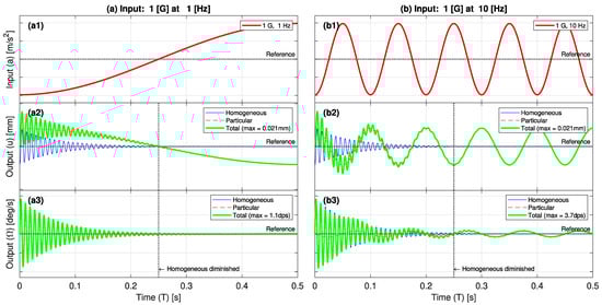 Figure 4 shows graphical representations of the input acceleration (Equation (14)) as well as the output deflection (Equation (17)) and angular velocity (Equation (20)) responses at the cantilever tip at input frequencies of 1, 10, 40 and 120 (Hz) and an acceleration of 1 (G) for a short period of 0.5 (s). Representations are constructed considering a cantilever of a natural frequency of 120 (Hz) (3 times the seismic frequency of 0.1~40 (Hz)) and arbitrary geometrical and material parameters. In all cases, the effect of the homogeneous solution diminishes after a very short period, hence the neglection of the homogeneous solution. In addition, at the same input acceleration (acceleration acts as a scaling factor) as the input frequency increases, the increase in the deflection amplitude is small. However, the increase in the angular velocity is more significant, hence the suitability of the gyroscope in sensing the input.