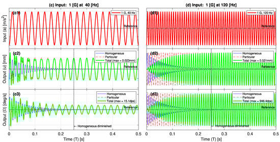 Graphical representations of the input acceleration and the output deflection and angular velocity responses at the cantilever tip (a) at 1 (G) and 1 (Hz); (b) at 1 (G) and 10 (Hz); (c) at 1 (G) and 40 (Hz); and (d) at 1 (G) and 120 (Hz).