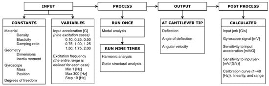 The L-35 jerk sensor simulation model was constructed and analyzed using ANSYS 2020R2 FE software. Modal and Harmonic analyses were performed to obtain the theoretical sensitivities and calibration curves. A flow chart of the simulation work is illustrated in Figure 5.