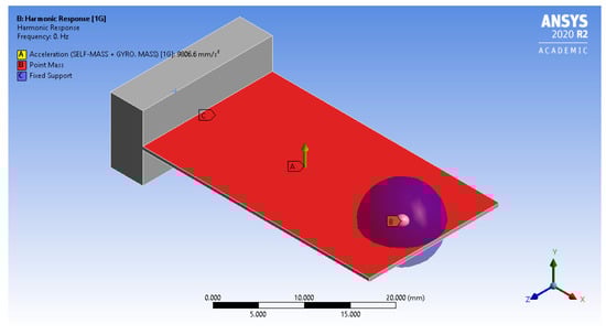 Based on the design criteria, the L-35 cantilever geometrical model of dimensions 35 × 20 × 0.5 (mm3) was constructed and attached to a fixed base of dimensions 5 × 20 × 10 (mm3), as shown in Figure 6. The printed circuit board (PCB) size for the suggested MPU9250 gyroscope mounted on the cantilever free tip was 25.5 × 15.4 × 1.5 (mm3). This size was considered when representing the affecting area of the PCB mass. An optimum mesh sized at 1800 three-dimensional cubic elements of length 1 (mm) was enough to have an absolute error of less than 1% compared to the analytical solution (Equation (17)).
