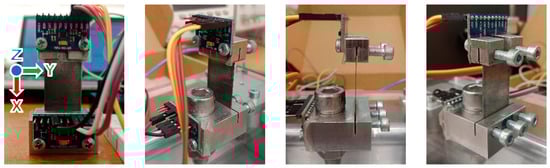 The experimented L-35 jerk sensor consisted of four parts: a cantilever strip of dimensions 35 × 20 × 0.5 (mm3), a base of dimensions 30 × 30 × 15 (mm3), a gyroscope and an accelerometer of dimensions 25.5 × 15.4 × 1.5 (mm3), as shown in Figure 7. All body parts were made of austenitic spring stainless steel 304. The cantilever strip was fixed to the base inside a built-in grove with a thickness of 0.6 (mm) and depth of 5 (mm) using 3 M5 bolts. The fixation method was designed to facilitate the trial testing of different cantilevers. The mass of the gyroscope was 3 (gm). The gyroscope was installed on the cantilever where the z-axis direction was out of the plane, as shown in the left photo of Figure 7.