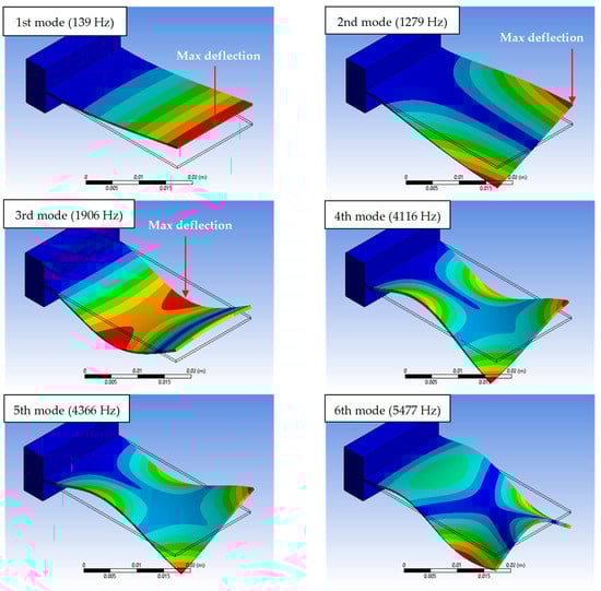 From FE results, the output angular velocity at the L-35 cantilever tip () was predicted, and the acceleration sensitivity () was calculated by dividing the angular velocity () by the input acceleration (). The jerk sensitivity () was obtained by dividing the acceleration sensitivity () by the input frequency () as in Equation (24). The input jerk () was calculated by dividing the angular velocity () by the jerk sensitivity () as in Equation (25).