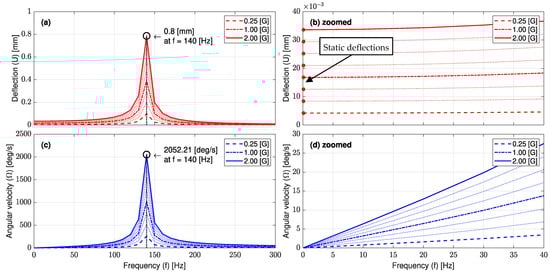 The combined effect of different magnitudes and frequencies of input acceleration on dynamic deflection and angular velocity at the tip of the L-35 stainless steel cantilever is shown in Figure 11a,c, respectively. These results were obtained from the FE-damped harmonic response analysis under the acceleration range of 0.1~2 (G) and the frequency range of 0~300 (Hz), which included the first mode natural frequency, 139 (Hz). In the meantime, the damping ratio of the stainless steel cantilever material was taken as equal to 0.02 []. Regarding Figure 11a, it can be seen that for all input accelerations, the deflection increased slightly as the excitation frequency increased up to 110 (Hz), whereas it started to increase rapidly as the frequency approached the natural frequency of the L-35 cantilever. After that, peak values were achieved at 139 (Hz), whereas deflection drastically decreased again when the excitation frequency increased beyond 139 (Hz). At a 2 (G) input acceleration, the maximum elastic deflection value was 0.8 (mm), which was still within the elastic limit of the cantilever material. Angular velocity values at the cantilever tip showed similar trends under the same input frequency and acceleration conditions, as shown in Figure 11c. It is worthy to note that the angular velocity at the cantilever tip did not exceed 28 (deg/s) at 2 (G) and 40 (Hz), which is very suitable for commercial small-sized gyroscopes utilized for seismic measurement.