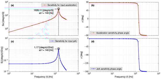 Bode diagrams as obtained from FEA for (a) sensitivity of jerk sensor for acceleration ; (b) phase angle; (c) sensitivity of jerk sensor for jerk ; and (d) phase angle.