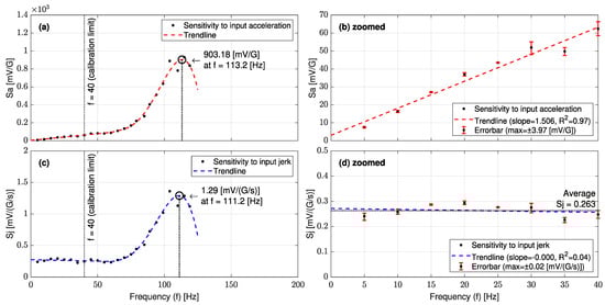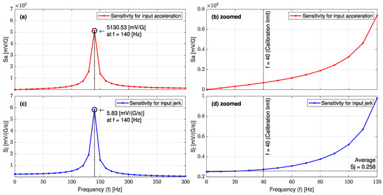 In the electrical domain, Figure 13a,c illustrate the jerk sensor sensitivity for input acceleration () and the input jerk () over the frequency range of 0~300 (Hz), respectively. Figure 13b,d show zoomed views of the linear parts of and . In the frequency range of 0.1~40 (Hz), it is seen that the jerk sensor sensitivity for the jerk () has a constant value of 0.258 (mV/(G/s)), whereas is a linear function of the input frequency. These trends of sensitivities are in very good agreement with the analytical equations (Equations (21) and (23)).