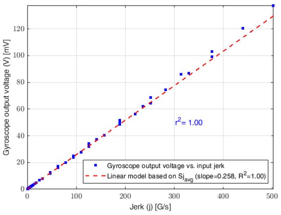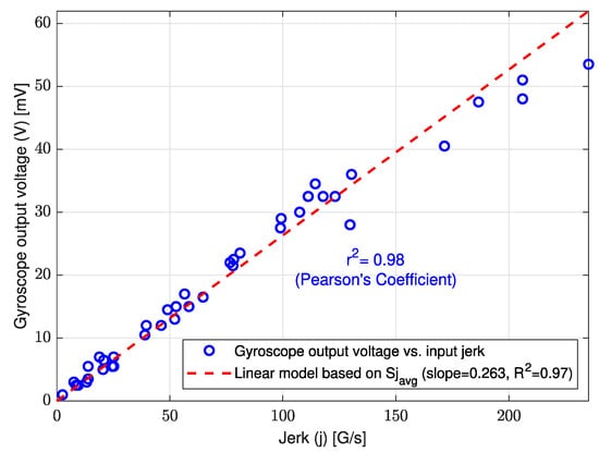 Figure 14 illustrates the theoretical calibration curve of the L-35 jerk sensor for the input jerk at a frequency range of 0.1~40 (Hz) and an acceleration range of 0.1~2 (G). Thirty-six data points were fitted using a linear model based on . The slope of the theoretical calibration curve, which represents the sensitivity of the L-35 jerk sensor model, is found to have an r-squared value of 0.99 and a ±1 linearity percentage. The theoretical maximum jerk of the L-35 model is found to be 4844 (G/s) or 47,512 (m/s3) at a 19 (G) input acceleration () and 40 (Hz) excitation frequency (). The theoretical jerk limit is based on the gyroscope’s reference voltage limit of ±1250 (mV) at the measuring range of ±250 (deg/s).