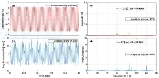 FFT analysis of a sample of the (a) accelerometer signal with its (b) amplitude spectrum, and (c) gyroscope signal with its (d) amplitude spectrum; signals were recorded at 60 (Hz) and 100% torque.