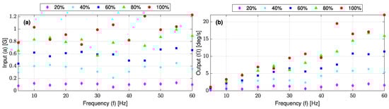 Figure 18 shows the experimental calibration curve of the L-35 jerk sensor for the input jerk at a frequency range of 0.1~40 (Hz) and an acceleration range of 0.1~1.2 (G). The linear fitting model is based on the average sensitivity for the input jerk and has a coefficient of determination () value of 0.97 with a high correlation coefficient () value of 0.98.