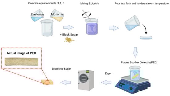 Additionally, to replace the role of the lung before wearing the clothing-type sensor, Ecoflex (Smooth-on Inc., Macungie, PA, USA) was used for the experiments. The process of creating Eco-flex with pores and the finished appearance are shown in Figure 2. The production process was followed according to the product manual. First, substances called “Elastomer” and “Monomer” were mixed in a 1:1 ratio, and then brown sugar was dispersed in the solution. A 3D mold with dimensions of 100 mm × 50 mm was used to make the size identical to that of the electrode. The mixed solution was stirred at 120 rpm for 15 min to separate and evenly distribute the brown sugar powder. The mixture was cured at room temperature (30 °C) for 3 h. After the curing time, the 3D mold was used to remove the mixture, and the sugar was dissolved in boiling water using magnetic stirring at 200 rpm for a minimum of 24 h. The porous Eco-flex dielectric (PED) sample was obtained as a result of the presence of air pockets formed during the process.