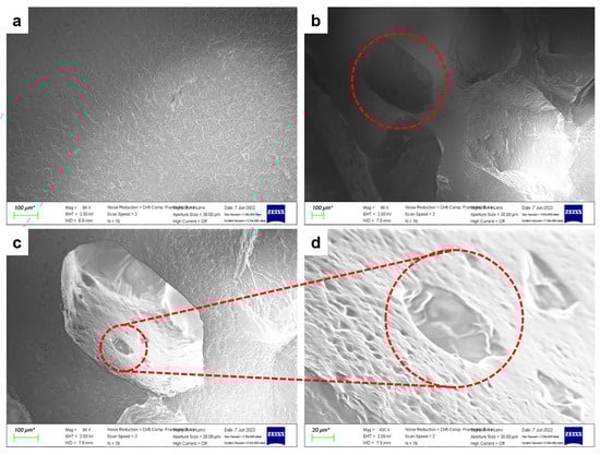 The morphologies of the Porous Eco-flex dielectric (PED) before adding the sugar and after dissolving in sugar are illustrated in Figure 3. Figure 3a shows the scanning electron microscopy (SEM) image of a PED before the adding process with a smooth surface. Furthermore, the surface in Figure 3b is proof that the Eco-flex underwent uniform dissolution with sugar, resulting in the formation of air pores. The presence or absence of sugar is a crucial factor as it determines the presence of air pores, which can indicate changes in conductivity. Figure 3c,d demonstrate the structure of PED with air pores.