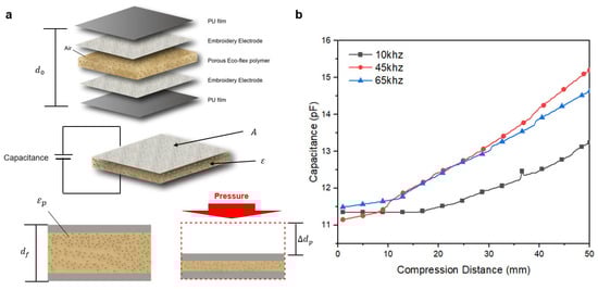 When an air layer is created using sugar in a porous Eco-flex (εp), as shown in Figure 4a, the dielectric constant and distance between the electrodes (∆dp) change under pressure. Under pressure, the dielectric constant and distance between the electrodes (∆dp) change in the case of a porous Eco-flex (εp), where sugar creates an air layer. Furthermore, the capacitance of the porous Eco-flex varies considerably, even under the same pressure, demonstrating that the shift in capacitance is significant []. When the pores are subjected to external pressure, the effective dielectric constant of porous Eco-flex (εr), which may be explained by Equation (2) [], rises []: