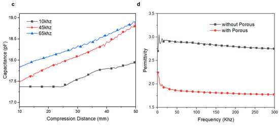 To set up the basic measurements, we conducted an experiment by providing a difference in frequency between 10, 45, and 60 kHz using an LCR meter (E4980AL) for frequencies below 100 kHz. A pressure tester (Dacell Co., Seoul, Republic of Korea) was used to determine the difference in the distance between the two electrodes according to respiration. In addition, as a preliminary experiment to select the most suitable frequency for actual movements, we replaced the volume of air in the lungs with Eco-flex and measured the capacitance according to the change in the dielectric due to the change in air volume. We measured the capacitance according to the change in distance between electrodes due to pressure and the change in dielectric due to the change in air volume and selected the 45 kHz frequency, which showed the highest change rate (as shown in Figure 4b) []. Furthermore, when comparing the nonporous Eco-flex dielectric (NPED) using the same three frequencies, it also exhibited the largest amplitude of change at 45 kHz. Compared to PED, the amplitude difference of PED ranged from 11 pF to 15 pF, showing a difference of approximately 4 pF, while NPED ranged from 17.5 pF to 18.75 pF (Figure 4c), indicating a difference of 1.25 pF. Therefore, as the dielectric properties exhibited greater variation with air expulsion, resembling the actual changes in lung air volume, PED was chosen for the experiments. The variation in air volume is represented by the dielectric constant, as shown in Figure 4d, which presents the results measured at frequencies ranging from 1 kHz to 300 kHz. In this graph, the presence or absence of air pores can be observed through the difference in the dielectric constant.