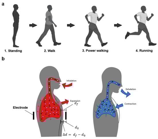 (a) Images of four actions (standing, walking, power walking, and running). (b) Changes in air volume in the lungs and abdomen induced by respiration.