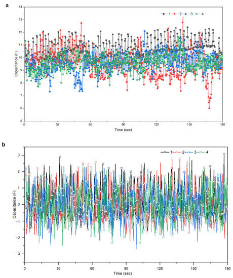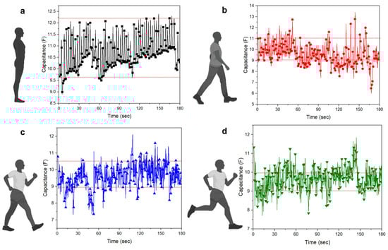 Respiratory measurements were conducted uniformly at the same locations. The participants wore respiratory clothing and completed five sets of 1 min each at the same frequency of 45 kHz. Four actions were proposed: standing, walking, power walking, and running. The data for each movement are shown in Figure 10. The characteristic features of the data were determined by the range of the measurement values. When standing, the range was between 9.75 and 12.25 F, for walking, it was between 9 and 11 F, for power walking, it was between 9 and 10.5 F, and finally, for running, it was between 9 and 10 F with densely packed data. If we convert these values into numerical ranges, the width of standing is 2.5 F, of walking is 2 F, of power walking is 1.5 F, and of running is 1 F. From these data, we can observe that the measurement range becomes narrower as body movements occur. This is because the pressure on the electrodes located on the abdomen and skin decreases as the respiration rate increases, leading to a decrease in the dielectric constant [].
