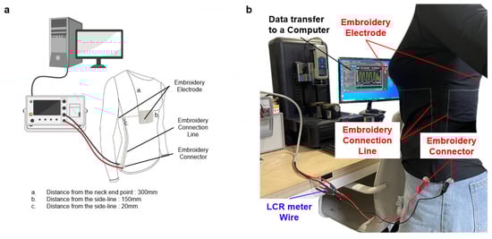 Basic respiratory measurements were obtained using a garment-based respiration sensor at 45 kHz. The subject was seated in a relaxed position for 1 min while natural breathing was recorded. The sensor was designed with embroidery to seamlessly integrate with clothing, and a cable was used to connect it to an LCR meter for measurement, as illustrated in Figure 8. The distance from the electrode to the shoulder endpoint (a) was 300 mm, the distance from the electrode without the connecting line to the lateral line (b) was 150 mm, and the distance between the connecting and lateral lines was 20 mm.