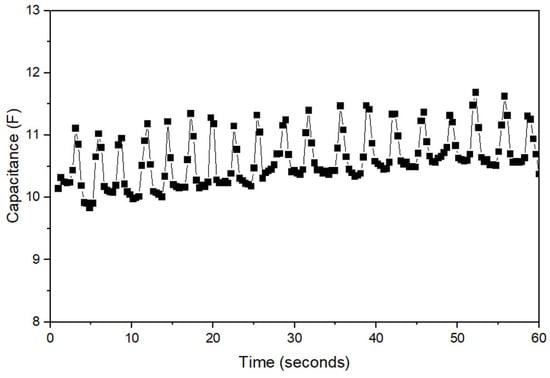 Real-time data were transmitted and monitored on a PC during the measurements. As shown in Figure 9, 19 respiratory cycles were observed within 1 min, with measurements ranging from approximately 9.5 F to 12 F. Because the sensor was designed without volume or weight, it did not interfere with the data output and performed similarly to an IMU. During inhalation and exhalation, changes in volume alter the distance between the electrodes and the pressure between the electrodes and skin []. Consequently, the capacitance was calculated. The dielectric constant of the skin layer is known to exhibit stable results in the frequency range of 10–50 kHz because of its lower loss coefficients, as shown in Figure 4b. During the experiment, the measured capacitance values were consistent with the actual respiration rate that was being measured. Moreover, real-time monitoring of respiration was possible on a PC monitor throughout the experiment.
