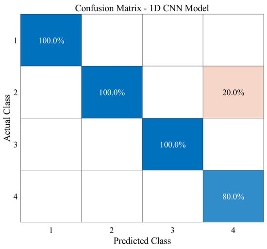 The output of the 1D convolutional layer was then transformed into a 1D vector using a 1D global average pooling layer. A fully connected layer with an output size of four or more classes maps the output of the layer to a vector of various probabilities. The softmax layer follows, and finally, the classification layer. The softmax layer applies a normalized exponential function to the input, converting a vector z of K real values into a vector K of probabilities, where the sum is 1. The input values of the function, which can be positive, negative, or zero, are transformed into values between 0 and 1, allowing them to be represented as probabilities. The following Equation (4) defines a function when K is greater than 1: