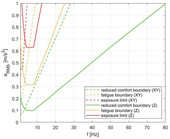 Reduced comfort boundary, fatigue-decreased proficiency boundary, and exposure limit for horizontal vibration (X, Y) with a dashed line and for vertical vibration (Z) with a solid line according to ISO 2631:1-1987 [6].
