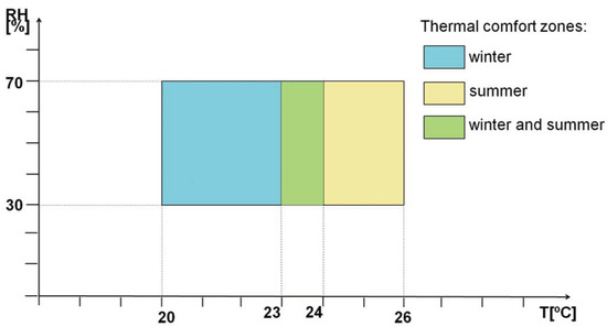 Among the numerous factors affecting thermal comfort, the most important should be indicated as air temperature and relative air humidity [31]. Too high a level of humidity can intensify negative feelings related to temperature. The ISO 7730:2005 standard [38] proposes a simplified approach that can be applied to less advanced analyses and that takes into account these main controllable factors. The document defines the so-called comfort zones separately for the summer and winter seasons. The ranges of recommended air temperatures and relative humidity in accordance with the standard are shown in Figure 2. Although this standard applies to buildings, it can also be used to analyze thermal comfort in vehicles.