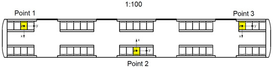The tests were carried out during the journey from the Marymont station to the Racławicka station. Three measuring points were chosen. These were located at the front, rear, and middle of the motor car. The location of the points is marked in Figure 3.