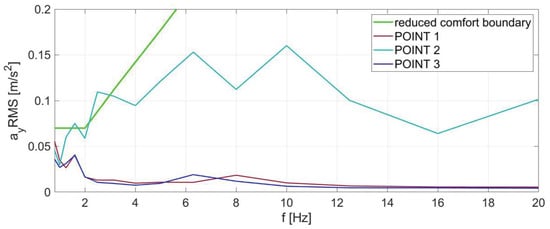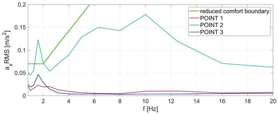 Figure 5 shows the results of the RMS vibration acceleration values in the one-third octave bands for the metro car under test at three measuring points. The presented values correspond to vibrations affecting the passenger in the direction X. At frequencies higher than 20 Hz, no exceedances of the reduced comfort boundary were found. Therefore, for better visibility of the results, the graphs have been limited to the 0.8 Hz to 20 Hz range.