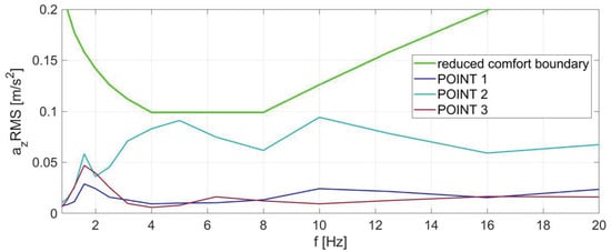 The results for direction Z are shown in Figure 7. In contrast to the results presented in the previous graphs, there is a significant difference in the RMS values of the vibration accelerations. The boundary defined in the ISO 2631:1 standard is not exceeded in any of the one-third octave bands at any of the measuring points. Such RMS values of vibration accelerations might be noticeable to passengers but would not cause discomfort. It should be noted that vertical vibrations are usually the cause of lower ride comfort, and therefore the presented results can be considered as very satisfactory.